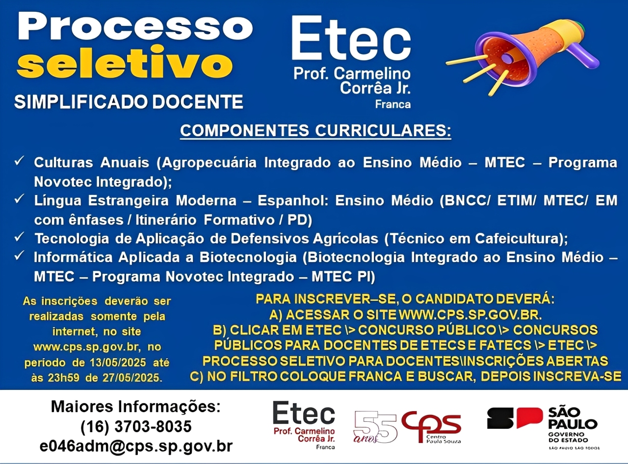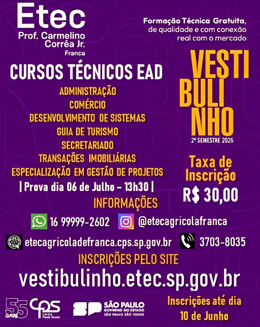 Abertura das inscrição para o Vestibulinho 2ºsemestre de 2025 das ETEC’s. Vem dar uma conferida no calendário. CALENDARIO De 12/05 até as 23h59min do dia 10/06Inscrições para o Processo Seletivo vestibulinho.etec.sp.gov.br, sendo o dia 11/06/2025 […]